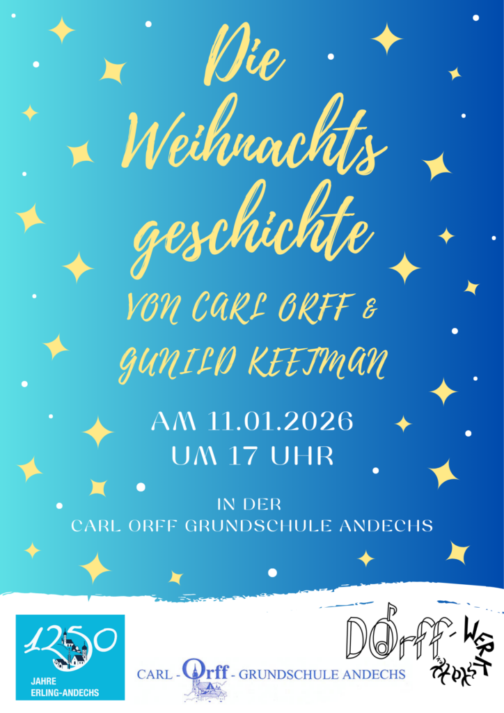 Herzliche Einladung zum Adventskonzert der DOrff-Werkstatt am 30.11.24 um 16 Uhr in der Carl-Orff-Grundschule in Andechs!